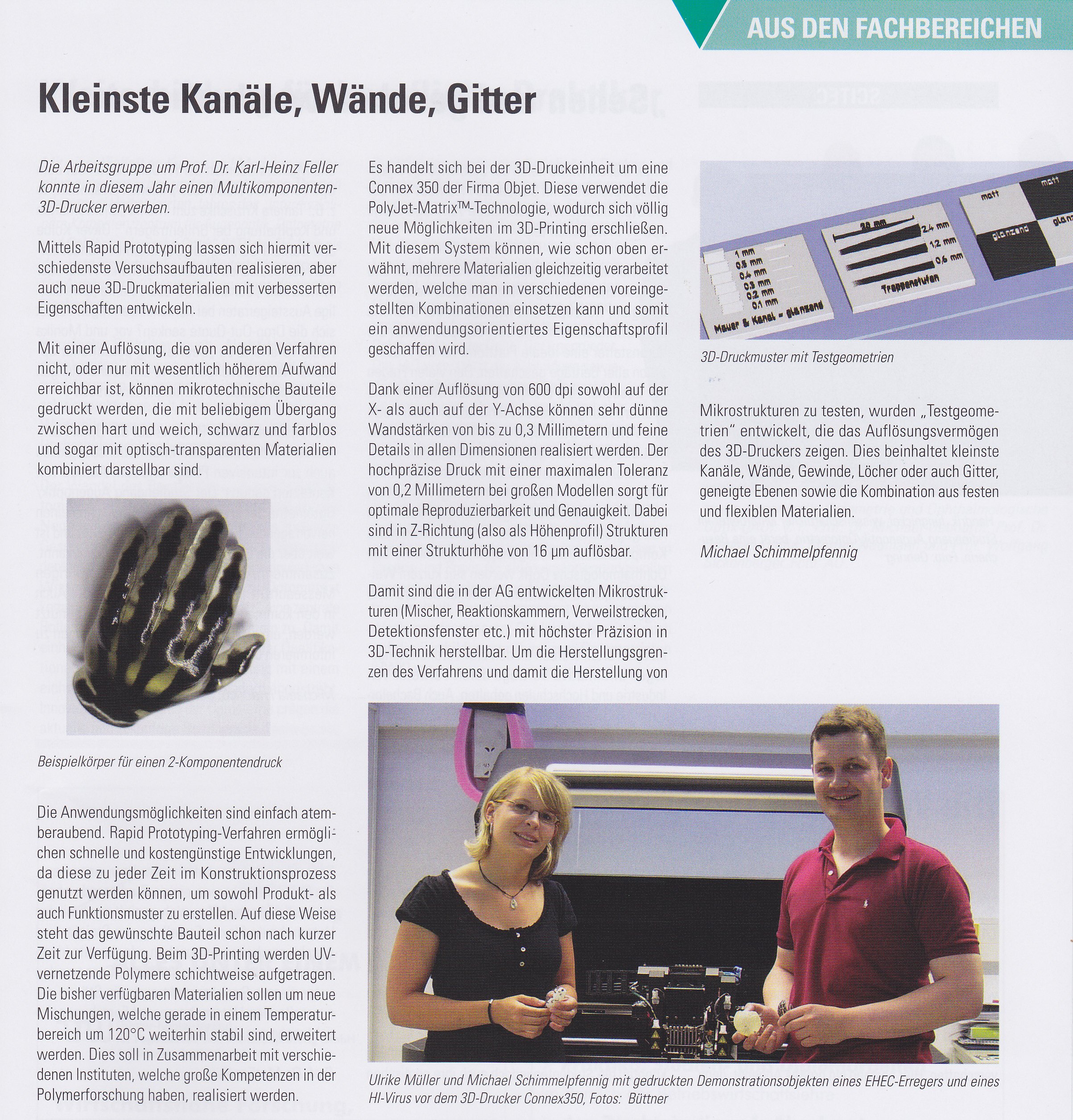 - Die Arbeitsgruppe um Prof. Feller konnte 2011 einen Multikomponenten-3D-Drucker erwerben.